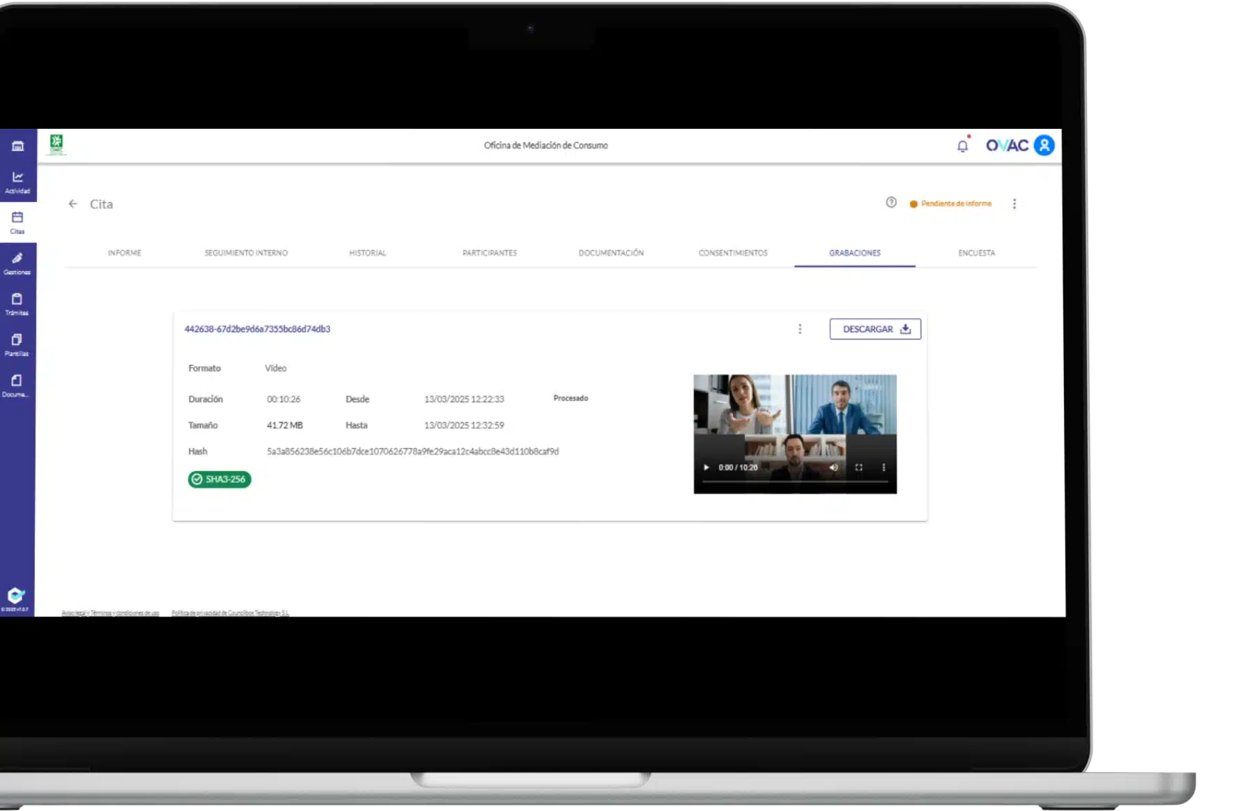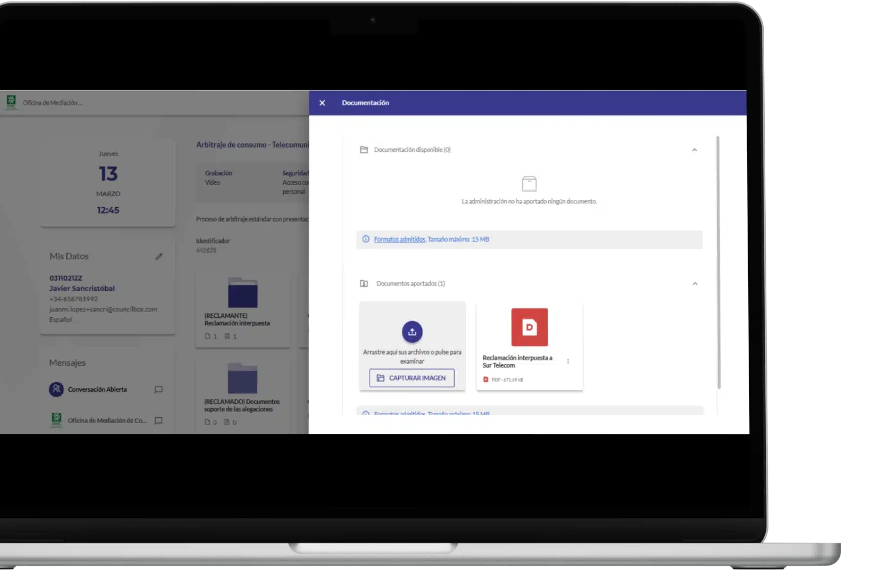 In this portal, in which you have to identify yourself using the method that is parameterized from among the existing ones (identification number provided, password for unique use, biometrics, digital certificate) you can provide documents, download and read those provided by the mediator or the other party in conflict, and communicate with the mediator.