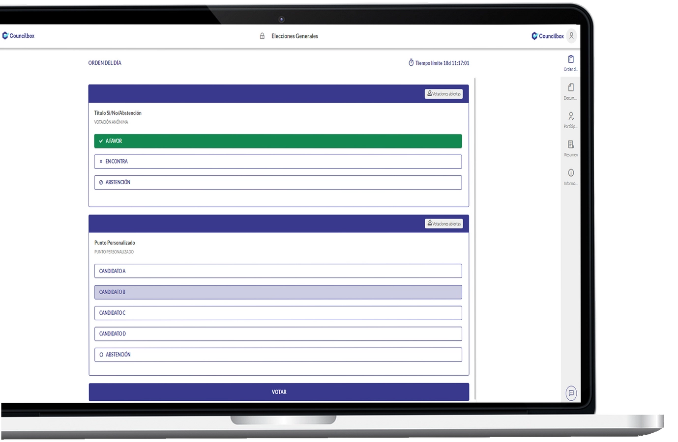 Parametrizzazione della durata del processo. Metodi di identificazione flessibili e pienamente validi. Votazioni remote, in presenza o in presenza con voto telematico. Parametrizzazione della tipologia di punti da votare (Sì, No, Astensione, ecc.). Possibilità di scaricare prova del voto e la prova immutabile di questa.