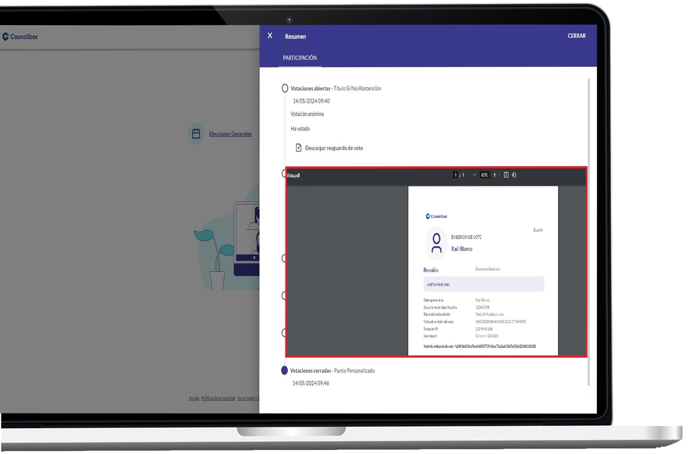 Tutti i voti sono registrati in modo privato, sicuro e immutabile grazie alla tecnologia Blockchain di Councilbox. Queste prove serviranno per dimostrare successivamente l’esito dei voti espressi, fornendo la necessaria sicurezza giuridica.